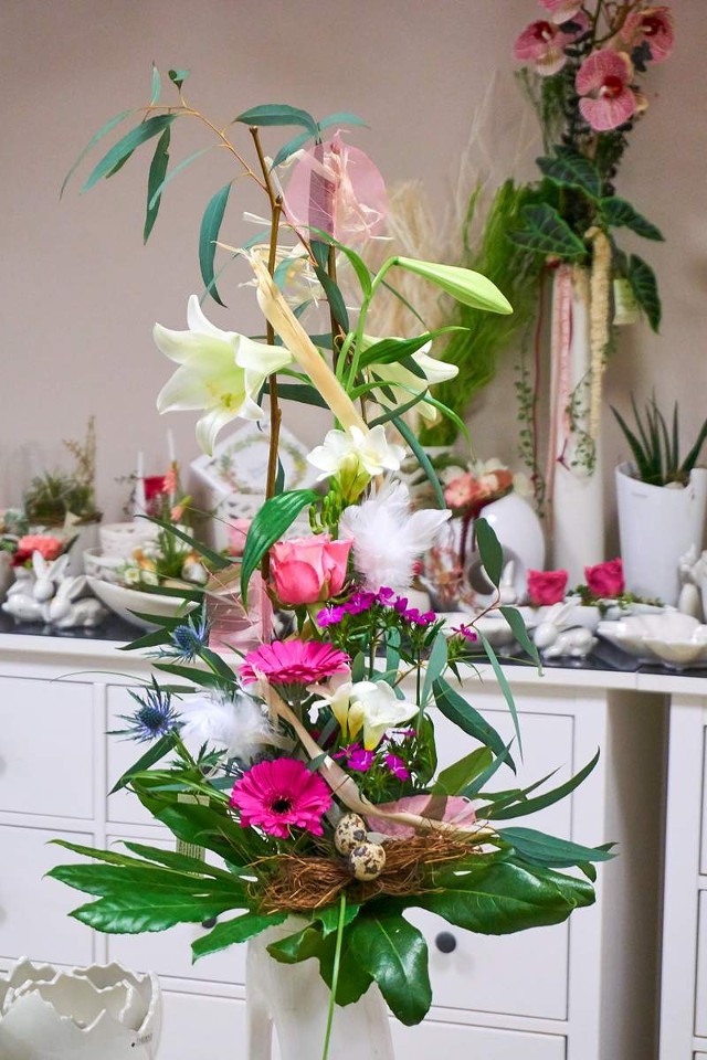 Versetzt gebundener Strauß aus Lilien, Rosen, Freesien und Gerbera österlich dekoriert