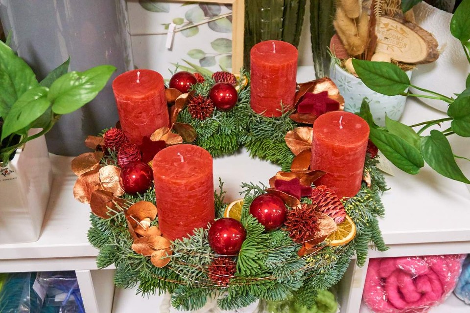 Adventskranz mit vier roten Kerzen weihnachtlich dekoriert.